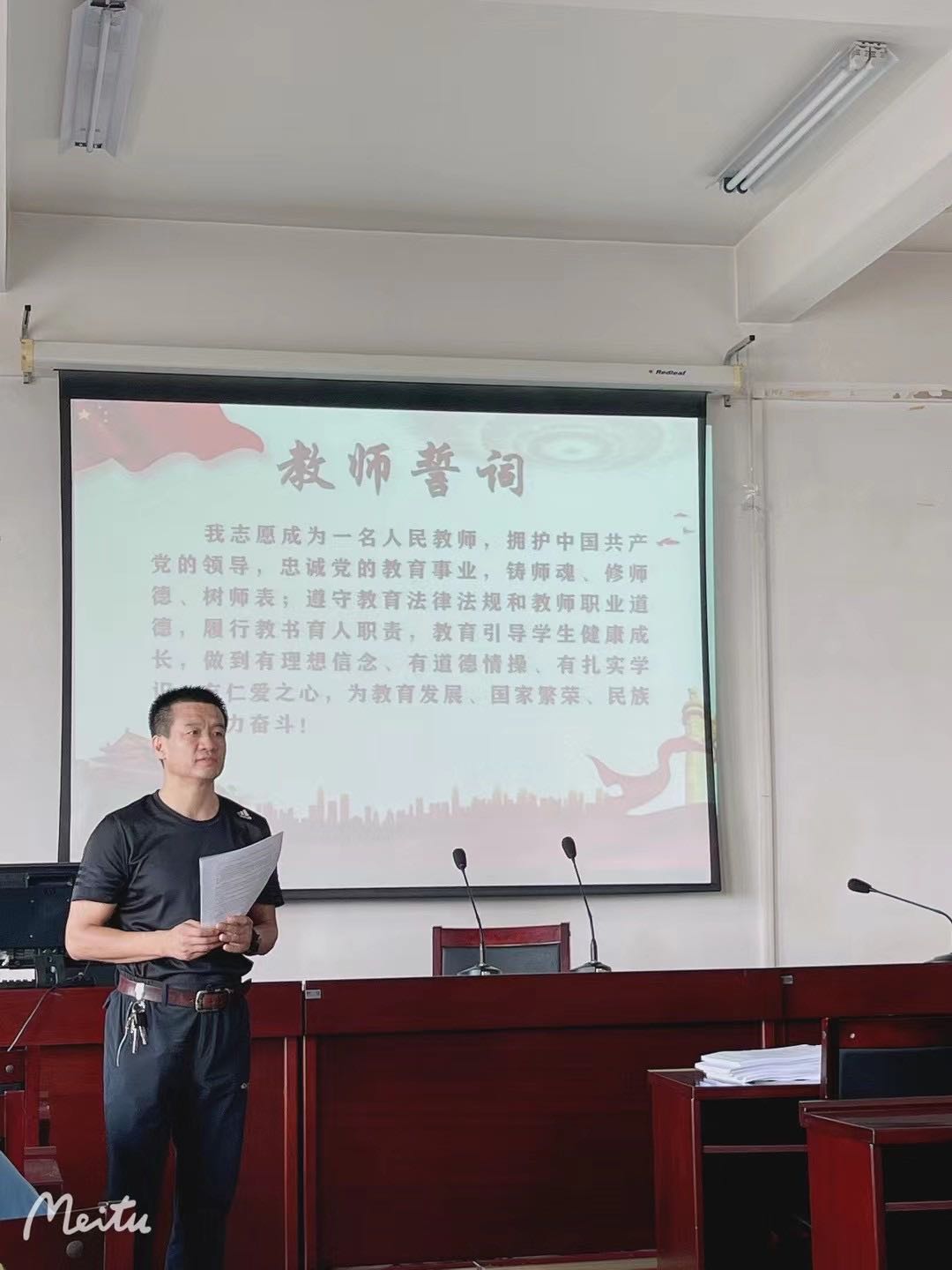 仪式上,王玉泉书记带领全体师生紧握右拳,面向国旗庄严宣誓:“我志愿成为一名人民教师,拥护中国共产党的领导,忠诚党的教育事业,铸师魂、修师德、树师表……”,用铿锵有力的声音许下了自己的坚定承诺。
