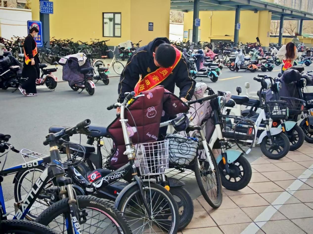 活动中,党员们分工协作,对楼宇周边乱停乱放的电动车、自行车进行集中整理、规范摆放,及时清理堵塞通道、影响通行的车辆,有效改善了宿舍楼宇周边环境,维护了整洁有序、安全畅通的校园秩序。