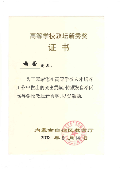 教学教改方面荣获各类奖项13项。主要包括:2012年内蒙古自治区第二届高等学校教坛新秀奖。2012年度包头市优秀教师。2005年永利y23455第一届“教学优秀奖”,2009年永利y23455第二届“教学优秀奖”,2011年永利y23455第三届“教学优秀奖”。2006年校级教学成果奖一等奖1项,2009年校级教学成果奖二等奖2项,2015年校级教学成果奖二等奖1项。