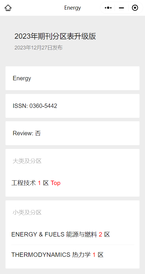 《Energy》期刊于1976年创刊,是位列中国科学院工程技术1区、WOS分区1区、JCR分区1区的SCI期刊。该期刊最新影响因子为9.0,研究内容涵盖了能源科学、技术和工程学科的各个方面,包括可再生能源、化石能源、能源转换、能源储存、能源管理等主题。