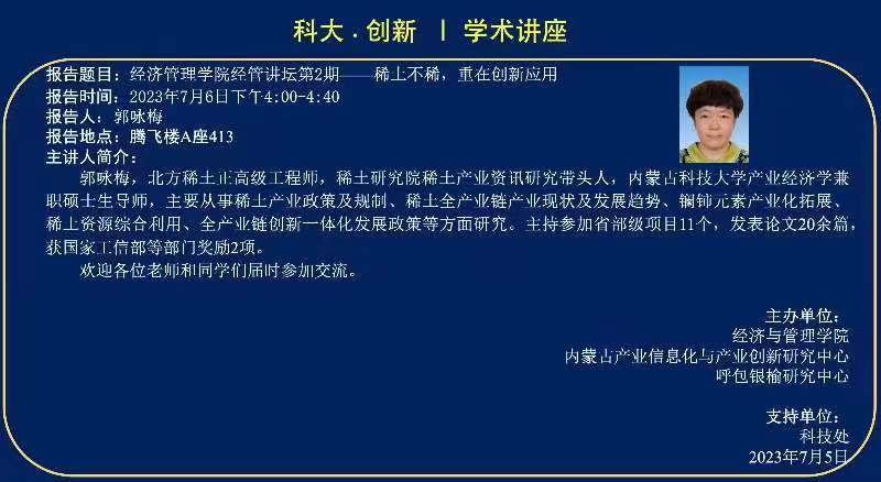 应yl23455永利集团邀请,7月6日下午北方稀土正高级工程师郭咏梅教授来访永利y23455,面向全校做学术报告,报告由经管学院赵周华副院长主持召开。