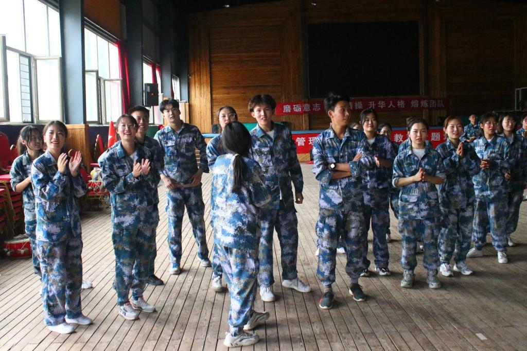 在开营破冰环节,全体学生按照规范操练立正、稍息各项动作要领。随后,按照教官的指令,通过高喊队名、宣传口号来彰显团队自身的士气。