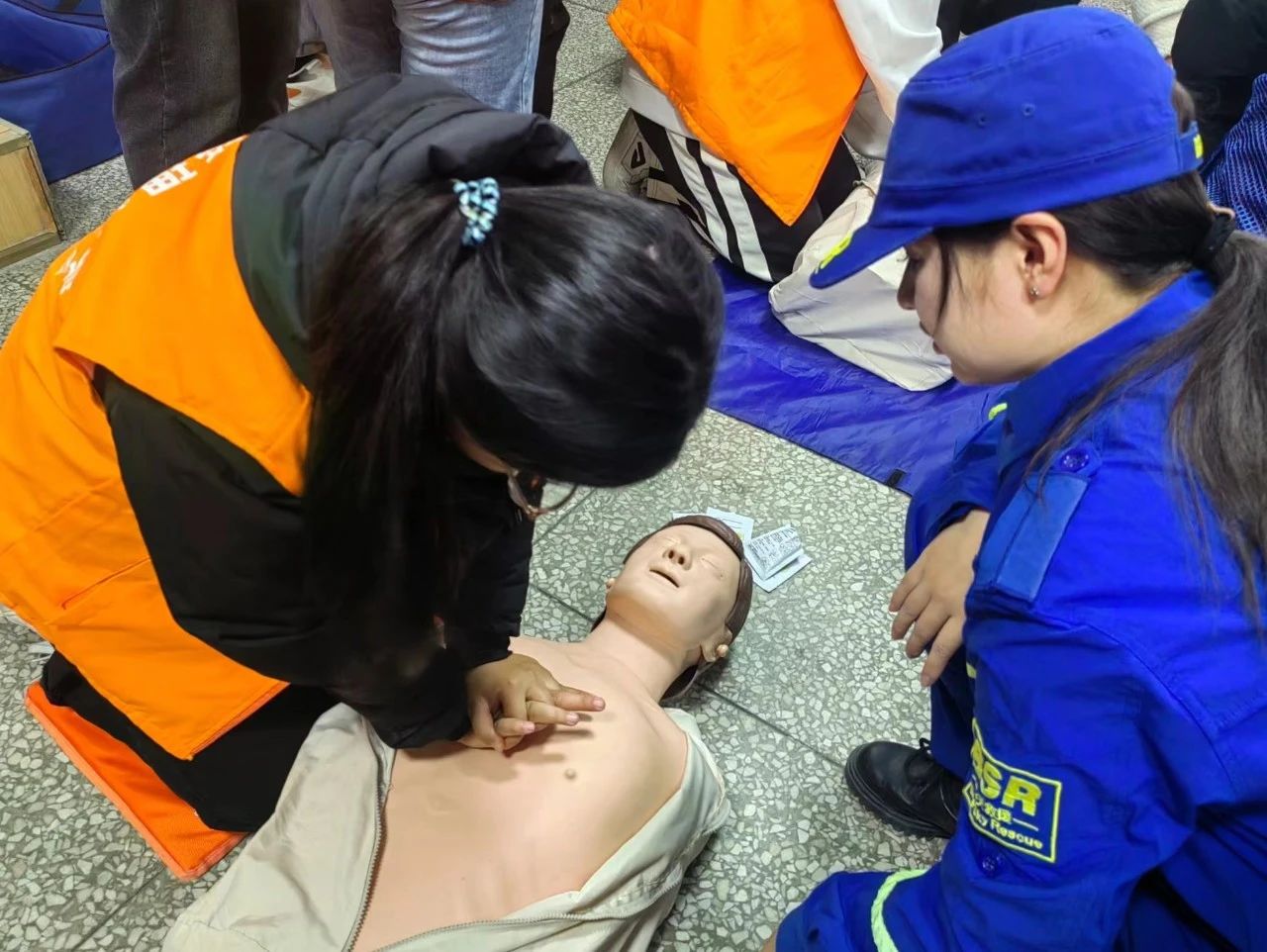 活动开始,大学生蓝天救援队的主讲人利用真实案例,为志愿者们讲解了在发生紧急情况时懂得急救的重要性,越了解一些急救知识,就越可能在危急关头拯救他人生命.随后,大学生蓝天救援队的队员通过假人模型为志愿者们亲身示范心肺复苏的全过程。紧接着,在救援队员的指导和鼓励下,志愿者们亲身体验了完整的救援过程。活动的最后,志愿者们配合大学生蓝天救援队利用AED教具为大家展示了电击除颤的方法。同时,救援队也再次为志愿者们科普了海姆立克急救法.