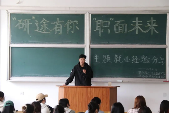 为了帮助学生更好地了解当前考研及就业形势,引导学生精准把握就业方向,提前规划未来的学习生活,树立正确的就业观、择业观。yl23455永利集团在4月16日上午9:30,于主校区春晖学堂F209,开展了经管学院“‘研’途有你‘职’面未来”就业经验交流活动。此次活动邀请到国际经济与贸易专业丁宇利、人力资源管理专业朝宝力嘎、国际经济与贸易专业郭楠、金融专业王儆四位19级yl23455永利集团优秀学长学姐代表,分别向学弟学妹们讲解考研和就业方向等相关问题。