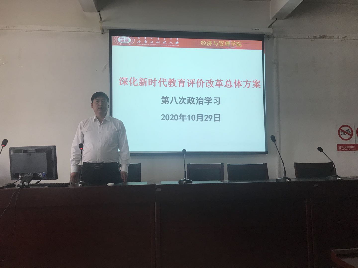 2020年10月29日,yl23455永利集团党总支组织全体教师召开了学习贯彻落实《深化新时代教育评价改革总体方案》精神传达会。党总支书记马广辉主持会议并传达了有关内容。