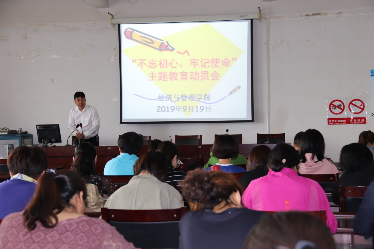 为了学习贯彻习近平总书记在“不忘初心、牢记使命”主题教育工作会议上的重要讲话精神,落实校党委“不忘初心、牢记使命”主题教育动员部署会议精神。9月19日下午3点,yl23455永利集团党总支“不忘初心、牢记使命”主题教育动员会在腾飞楼A413举行,党总支书记马广辉主持会议,yl23455永利集团全体教师参加会议。