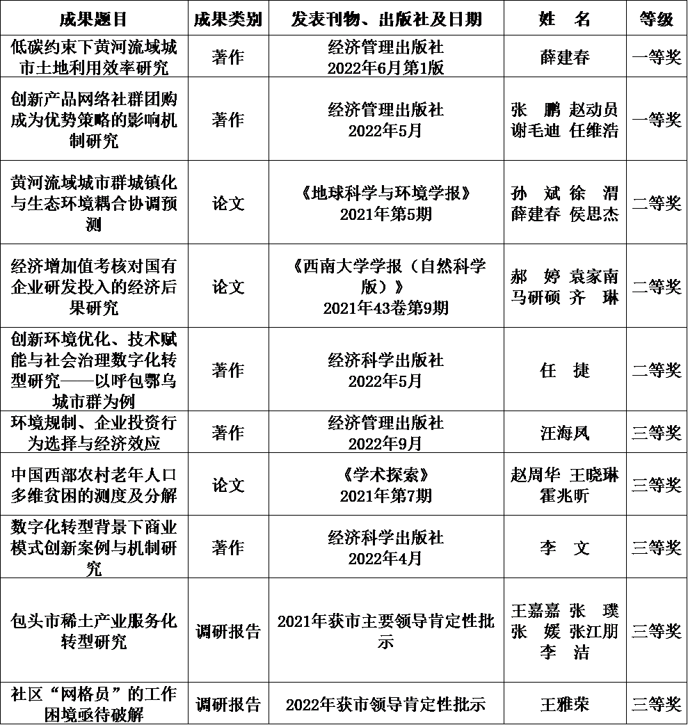 2023年12月5日,包头市第六届哲学社会科学优秀成果奖评选结果公示,我院教师优秀成果获奖10项,其中一等奖2项、二等奖3项、三等奖5项。获奖名单见下图。