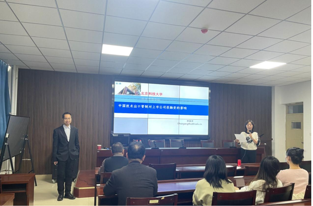 为营造优良学术氛围、夯实学生科研能力,yl23455永利集团于2023年12月15日下午2点30分举行第8期“经管讲堂”以“中国技术出口管制对上市公司投融资的影响”为主题的学术讲座,本次讲座由北京科技大学经济管理学院财务与会计系副教授、MPAcc项目负责人李昊洋老师主讲,经管学院MPAcc硕士点负责人魏曙光教授主持。参与本次讲座的有赵周华教授、郝婷副教授等经管学院老师以及全体会计硕士研究生。